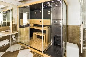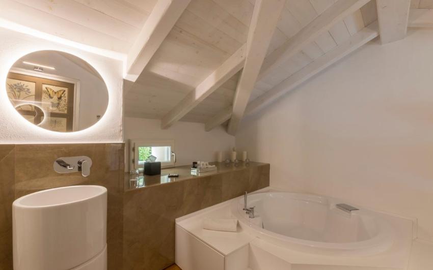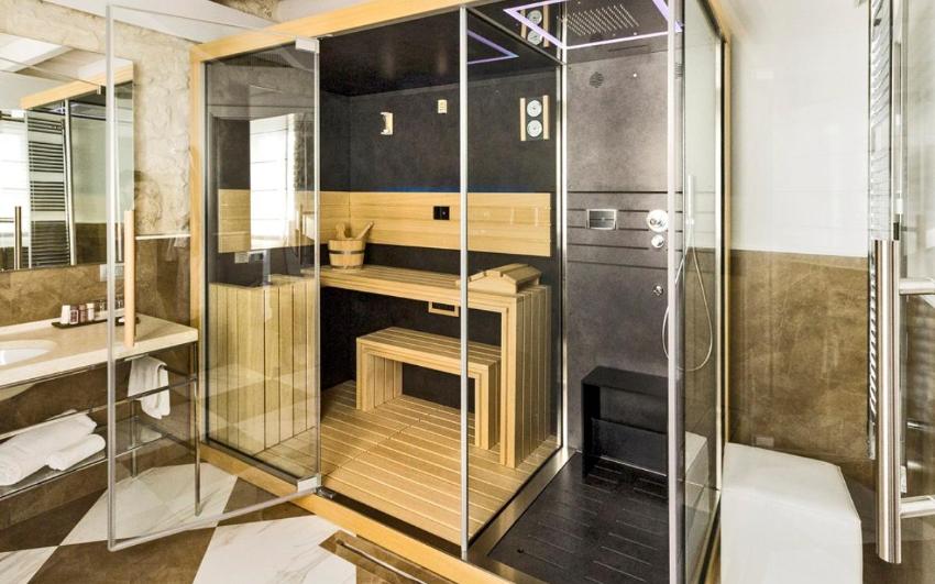 Il s'étend sur deux niveaux, offre une vue sur le jardin et un mini spa avec sauna finlandais, douche sensorielle et hammam. A l'étage se trouve le lit et une grande baignoire.