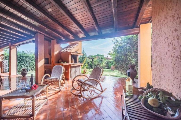 La véranda dispose d'un coin salon, d'un coin repas, d'un barbecue et d'un four à pizza.