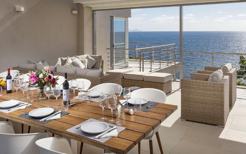 Une grande terrasse de 100 m², avec toit amovible, est située au premier étage. Elle est ombragée par un store électrique et donne directement sur le golfe.