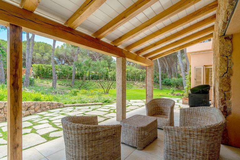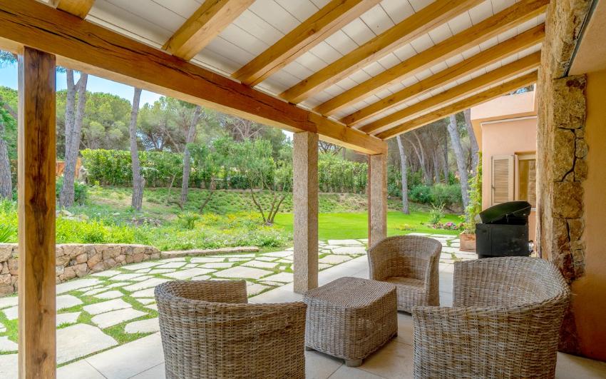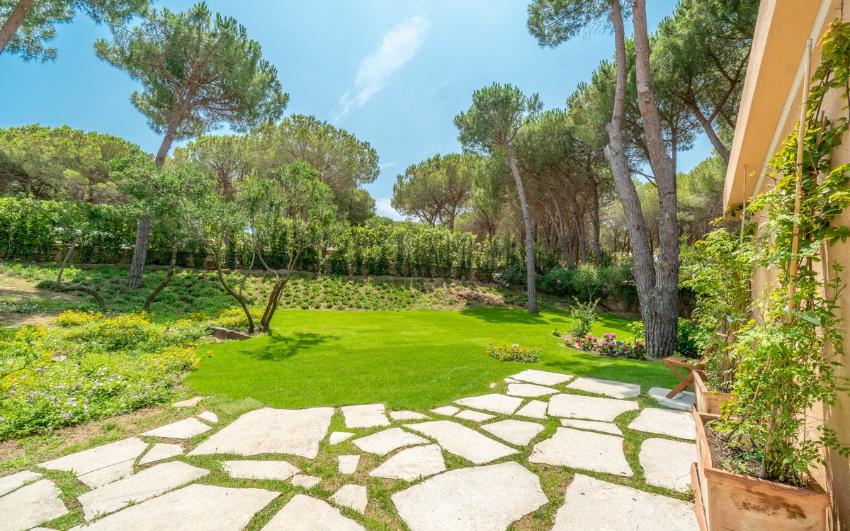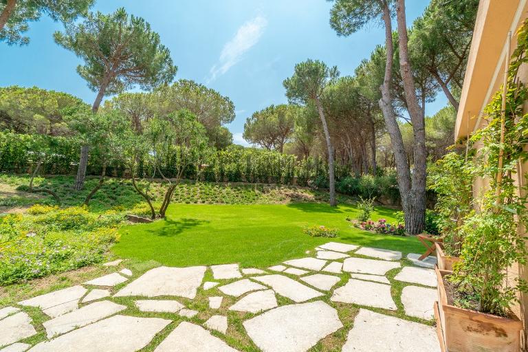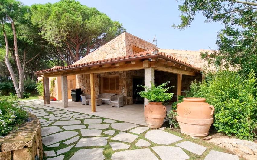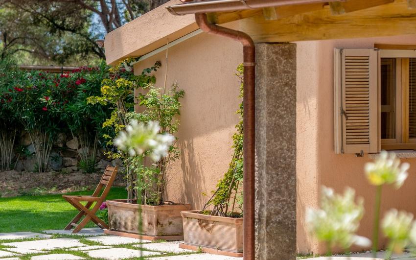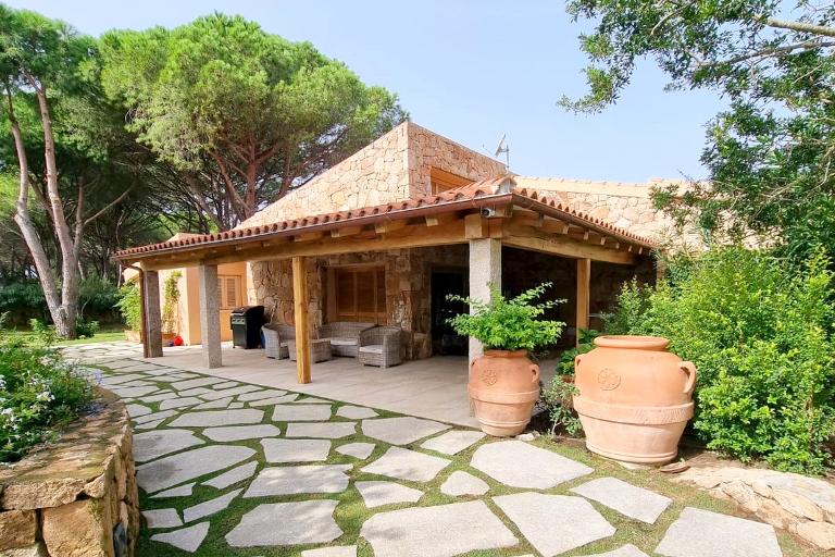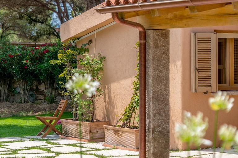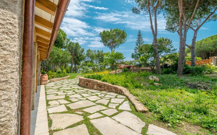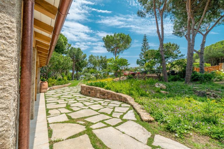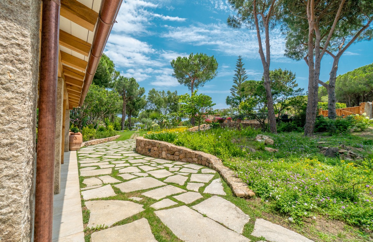 Capo Coda Cavallo, nestled within a lush Mediterranean garden with lawns and a variety of blooming plants. The house enjoys a