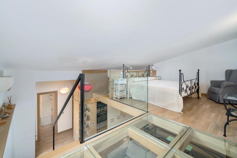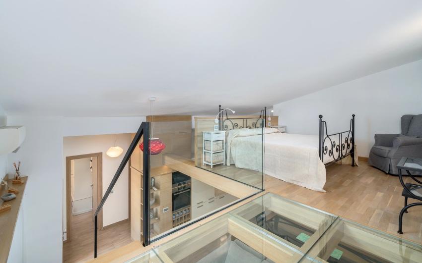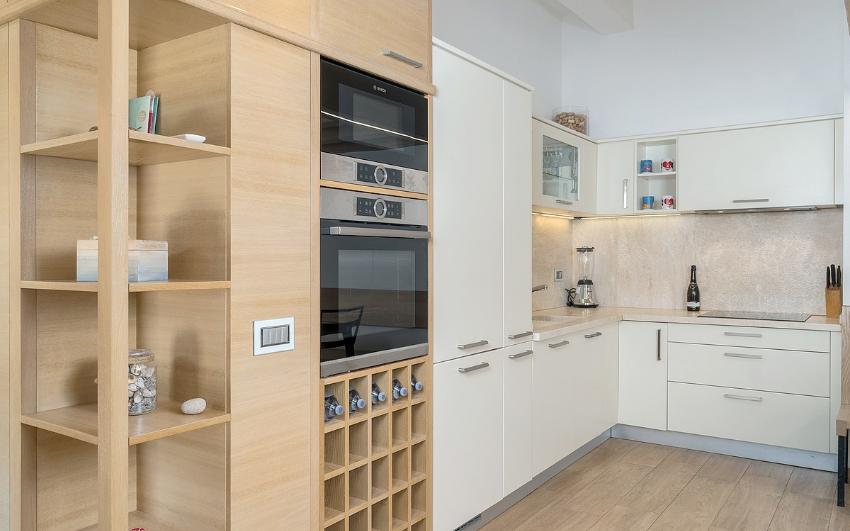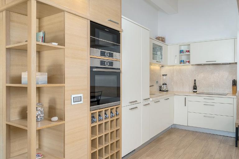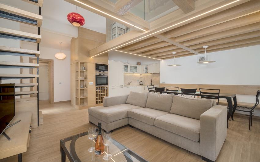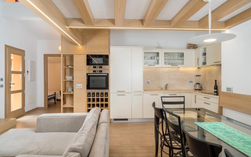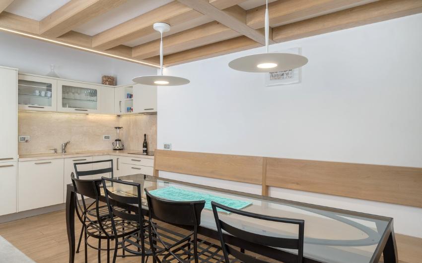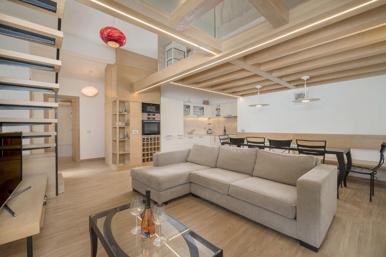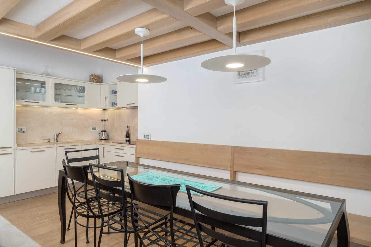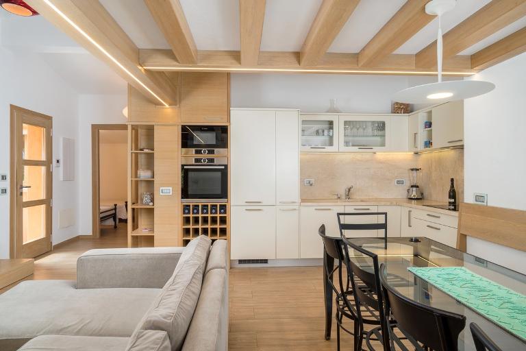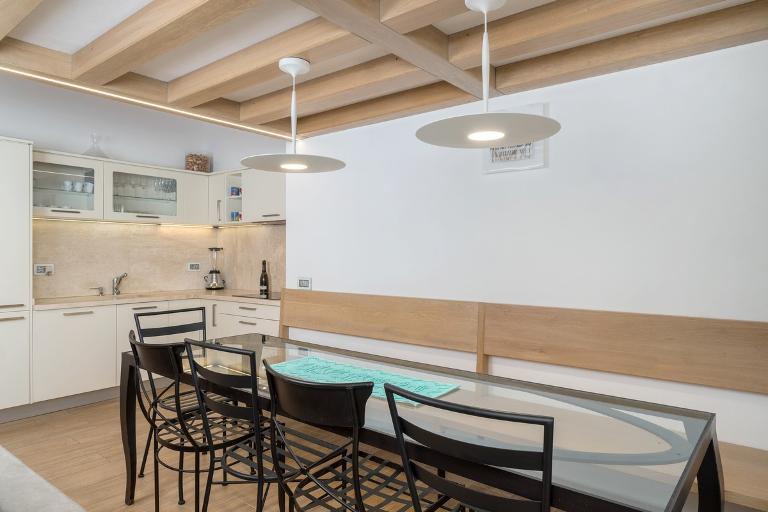 The bright and welcoming living area consists of a fully equipped open-plan kitchen and a living room with a comfortable sofa and a large dining table, ideal for up to 6 guests.