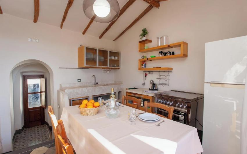 - Cucina completa: piano cottura, forno elettrico, frigorifero, tavolo e sedie