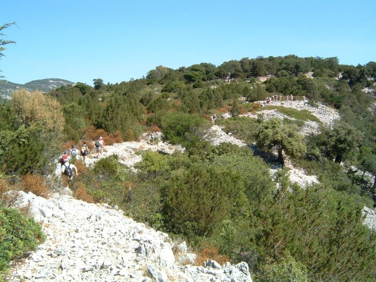- Lasciata Cala Sisine, si risalirà su una ripida pietraia fino a raggiungere un sentiero che attraversa un bosco di lecci e corbezzoli, che conduce all’ovile Irove Longu e da qui inizia la discesa verso Cala Luna. Durante il percorso si potrà ammirare S’Archittu de Lopiru, una bellissima e scenografica arcata di roccia calcarea.