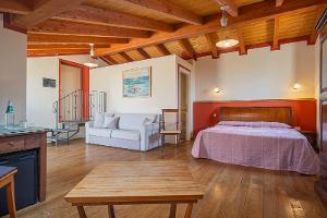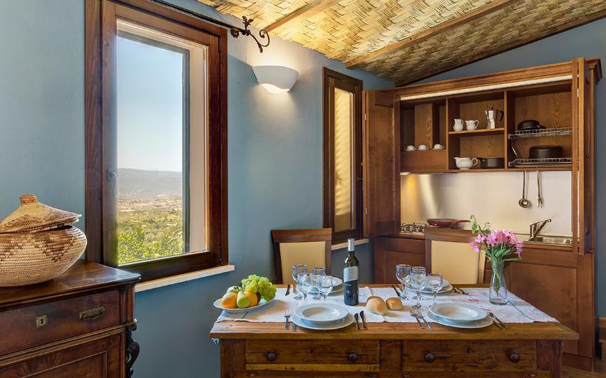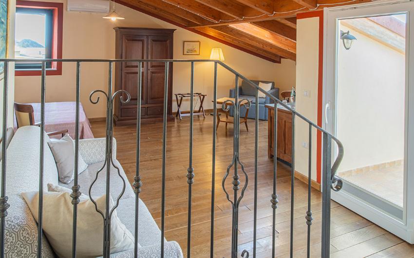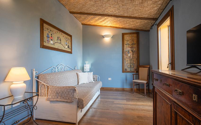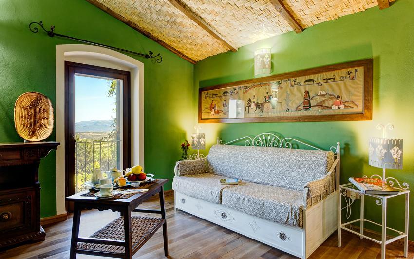 Le suite si compongono di due spazi indipendenti: la zona notte con il letto antico o in ferro battuto, i tessuti artigianali sardi e, in alcuni casi, i mobili antichi; la zona giorno con tavolo, sedie e un ampio divano letto per due persone.