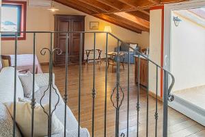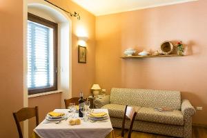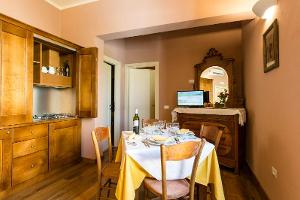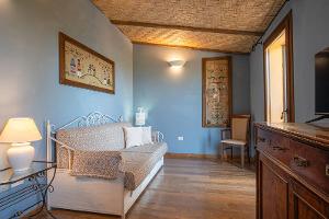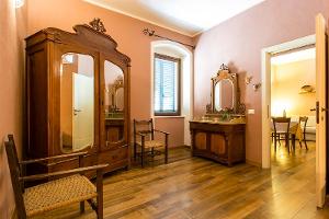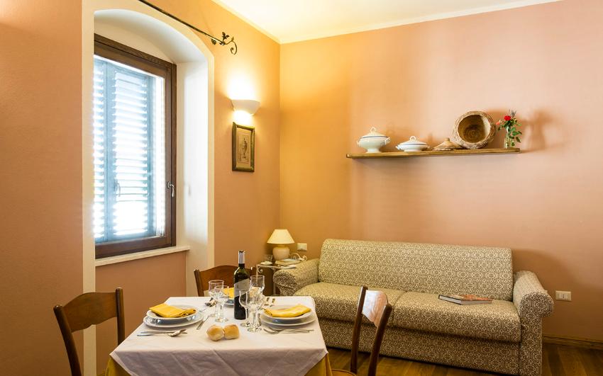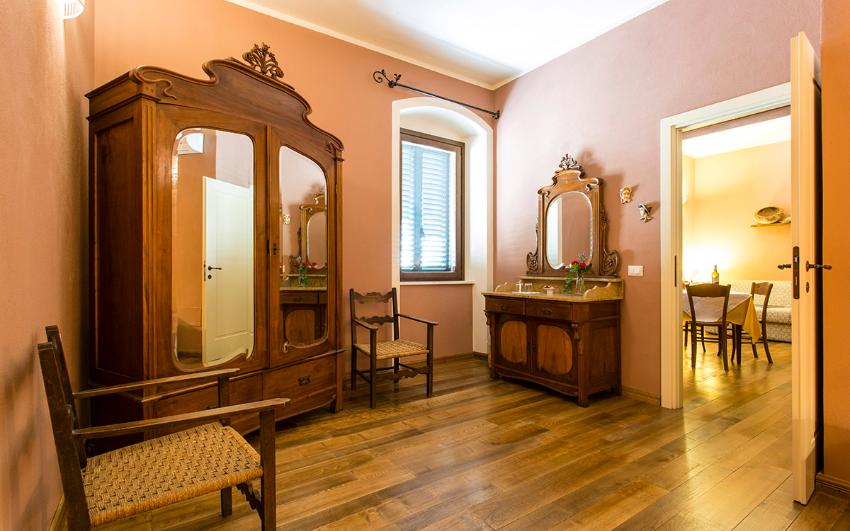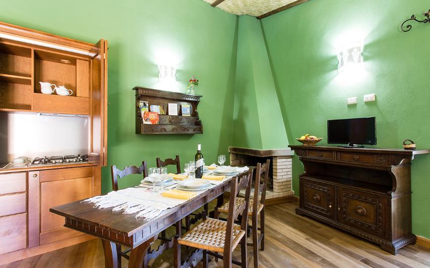 Gli interni con il grande soggiorno impreziosito dagli stucchi sul soffitto, le antiche mattonelle i mobili originari, sono lo spazio tranquillo per dedicarvi piacevolmente a chiacchierare, leggere o guardare la TV.