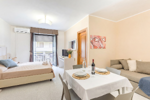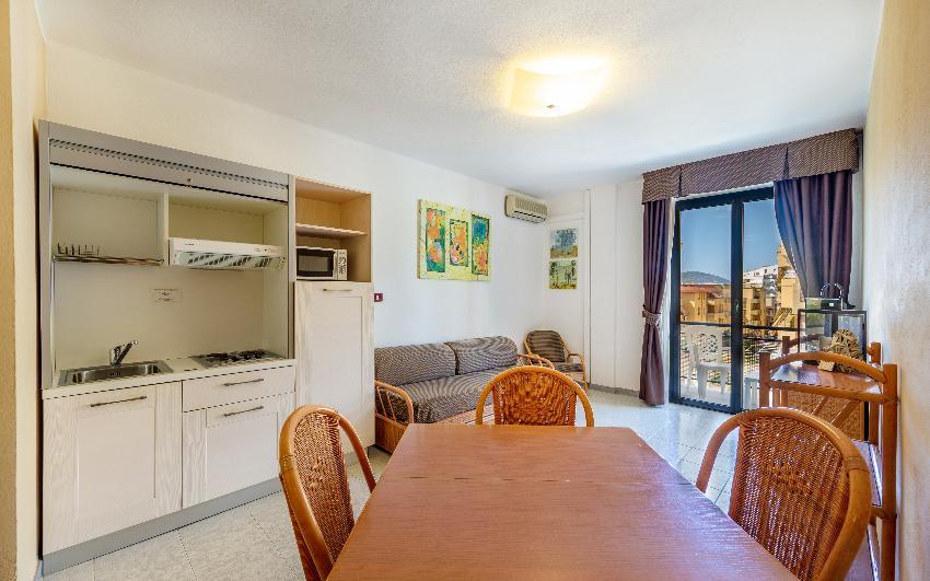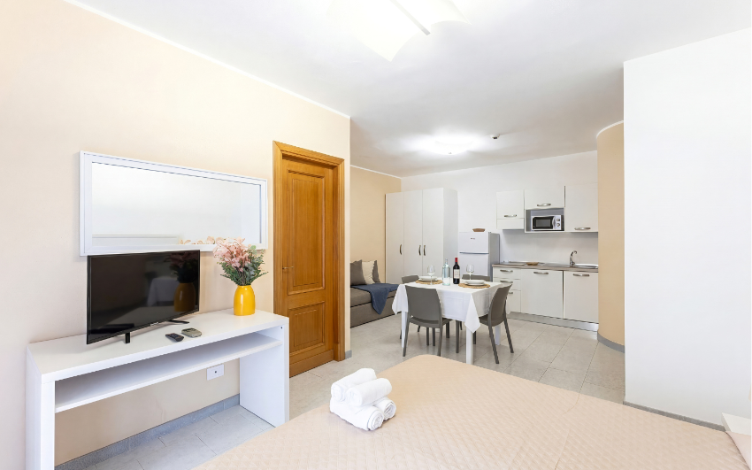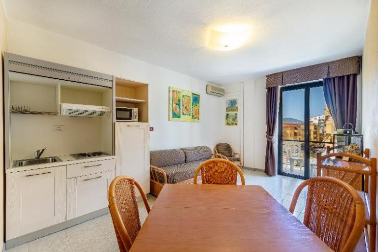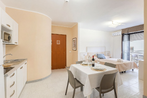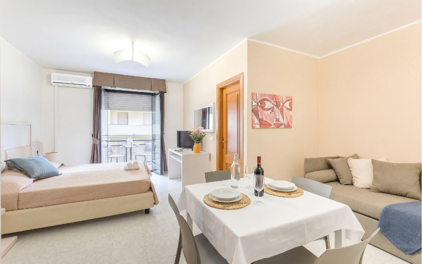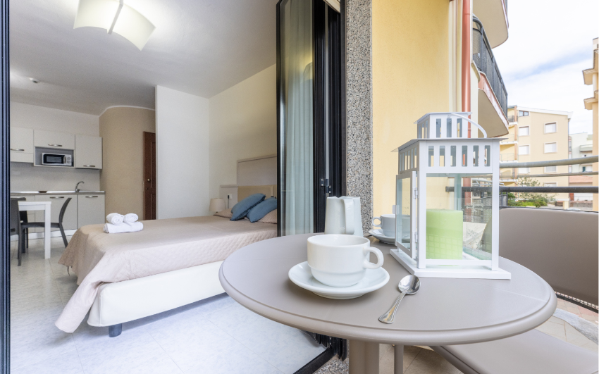 Ambiente unico con angolo cottura, letto matrimoniale o due letti singoli, eventuale letto aggiunto e bagno con doccia. Balcone attrezzato.