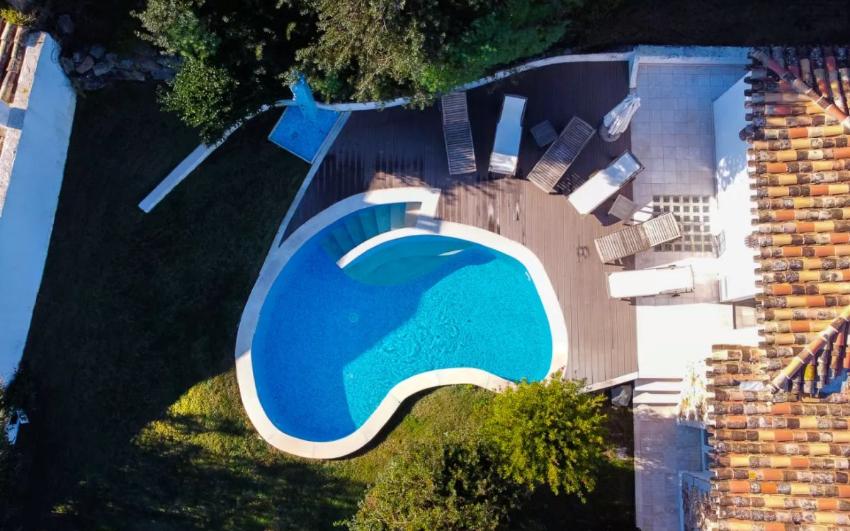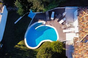 De ruime villa met 2 verdiepingen en een heuvel is omgeven door een aangelegde tuin met gazons en mediterrane vegetatie en is 800m2. Het zwembad bevindt zich op het niveau van de 1e verdieping van de villa.
